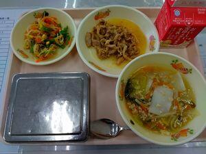 ごはん 焼き肉(セルフビビンバ) ナムル(セルフビビンバ) 塩ワンタンスープ 牛乳