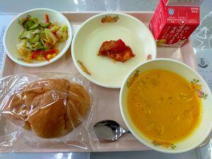 今日はパンプキンスープです。しっかり食べて,かぜに負けない体をつくりましょう。※栄養士の先生から子どもたちへのメッセージ:給食一口メモ「いただきます」より