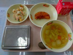 ごはん ささみのアップルソースがけ れんこんサラダ コロコロスープ 牛乳