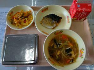 舞茸ごはん 鯖の塩焼き きんぴらレンコン じゃが餅味噌スープ 牛乳