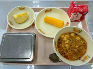 ごはん たまごロール 麻婆豆腐 りんご 牛乳