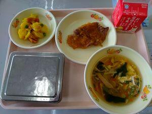 ごはん 豚肉のアップルソースがけ ジャガイモのカレーソテー たまごスープ 牛乳
