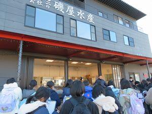 最初は全員で,磯屋水産の方からお話を伺いました。お店も見学させていただいたのですが,温暖化の影響で三陸でも獲れるようになった魚が飼育されていて子供たちは興味津々。また,鮭やサンマなどの不漁に関わる食物連鎖のバランスのことなど,日頃から魚と関わっている方から直接お話を聞くことができ,学ぶことが多くありました。
