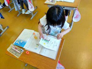 1年1組では教科書と同じ画像をパソコンからモニターに出力して子供たちに見せていました。「パンダは前から何番目?」「右から5番目の動物は何?」という問いについて子供たちは自分の教科書で調べ,発表された答えをモニターで確かめていました。