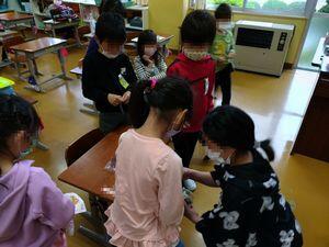 外の活動ではありますが,徒競走やリレーなど全力で走るとき以外は原則マスクを付けての活動です。また,競技の前後は手指の消毒をすることにしました。子供たち同士で声を掛け合って消毒をしていました。