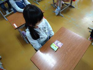 続いて1年1組に来たのは保健委員会のお姉さんです。毎週金曜日は清潔調べで,ハンカチ,ちり紙,つめ,名札をチェックするためです。1年生のほとんどが合格でした。