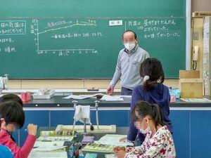 2校時,校舎を巡視していると,理科室から子供たちの声が聞こえました。覗いてみるとS先生が授業をしていました。S先生は4,5,6年生の理科の教科担任として学習を進めています。
