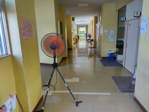 エアコンで冷房中だと冷気がもったいない気がしますが,換気は大事なので常時行っています。2学期とともに戻ってきた暑さのせいか,3階は廊下の空気がもわっとしていたので,業務用の扇風機を設置して空気を循環させるようにしました。休み時間,その風に当たりながら「前より良い感じです」と6年の女子が教えてくれました。