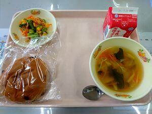 チョコレートパン ブロッコリーサラダ ベーコンとキノコのスープ 牛乳