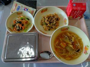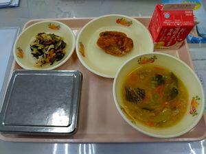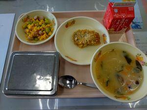 ごはん 鶏肉のカレーパン粉焼き 三色ソテー 豆乳スープ 牛乳