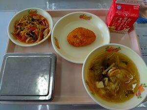ごはん 鮭とキャベツのメンチカツ 豚肉のキムチ炒め ホタテとワカメのスープ 牛乳