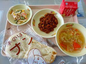 ナン 豆入りドライカレー れんこんサラダ ABCスープ 牛乳