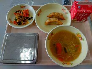 今日の給食の「ワンタンスープ」には,宮城県産のお米から作られた「米粉ワンタン」が使われています。いつものワンタンは,つるっとした食感が特徴的ですが,今日の米粉ワンタンは,もちっとした食感が特徴です。宮城県の恵みに感謝し,味わっていただきましょう。