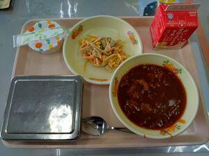ごはん ごぼうサラダ ポークハヤシ フローズンゼリー(オレンジ) 牛乳