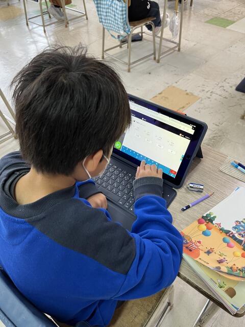 3けた+3けたの筆算の学習です。位ごとそろえて書くこと、繰り上がりに気を付けて計算することを確認し、練習問題に取り組みました。教科書の問題が終わると、プリントの問題、それが終わるとタブレットドリルでどんどん進みます。タブレットの扱いもお手のもです。