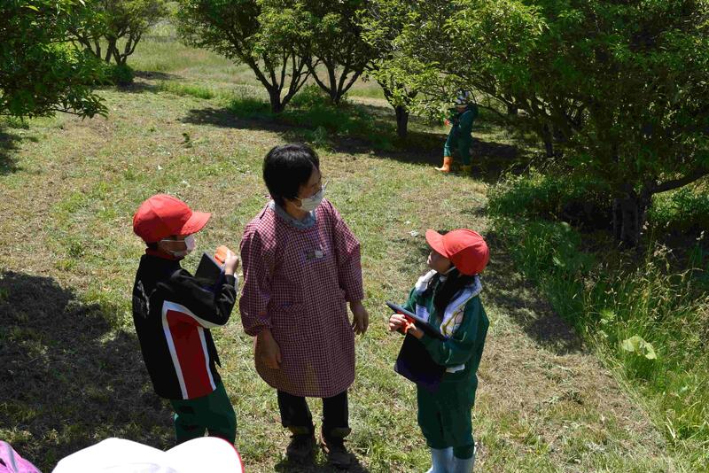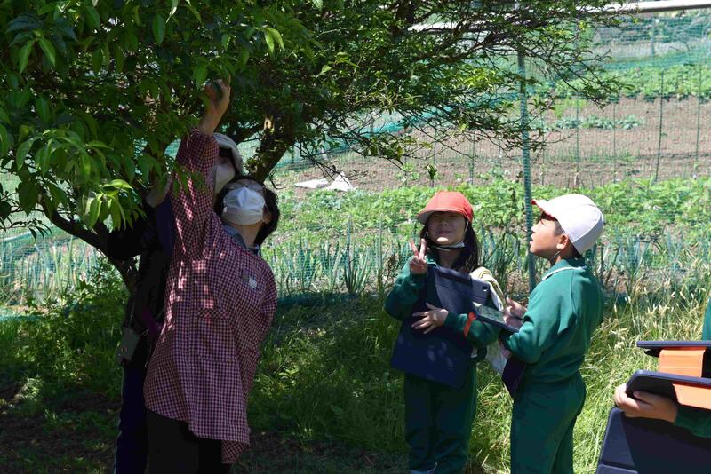 柚農家のお宅を訪問し、柚の木を観察しました。白い花をタブレットで写真に撮ったり、観察カードにスケッチしたりしました。柚は、葉の形が特徴的で、ひょうたんのような形をしていました。最後に柚の先生に柚について質問をしました。植えている柚の種類や柚が実るようになるまでに何年かかるかを質問しました。次にお邪魔するのは10月~11月頃。収穫のお手伝いをします。