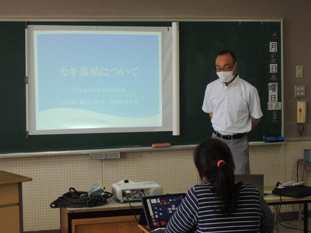 総合的な学習の時間に、小松武様を講師に招いてカキの講話を行いました。スライドを見たり実際にカキや道具に触れたりしながら、大島のカキがどのように生産されているかを教えていただきました。子供たちはメモをとりながら話を聞き、意欲的に感想を発表することができました。ご多用の中、対応していただいた小松様、地域コーディネーターの岡崎様に、心より感謝いたします。
