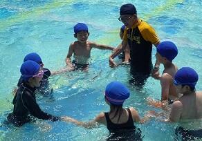 後半はペットボトルを使って体を楽に浮かばせる方法を練習し,ペットボトル1本で思ったよりも体が浮くことを実感していました。はじめて浮くことができた子は,「浮けた~!」と歓声も上がり,感覚を体感できた様子でした。