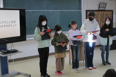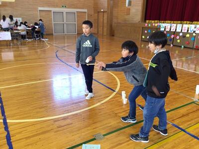 くぐなり児童会が中心となって、1年生をむかえる会を行いました。プログラムはくす玉わり、学校紹介、クイズ、ゲーム、自己紹介と進み、最後はプレゼントをもらって、新1年生は上級生と楽しく交流することができました。