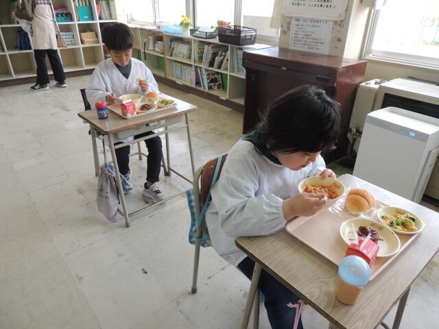今日の給食は、コッペパン、ミートボール、ほうれん草とコーンのソテー、白花豆のミルクスープです。今日は3年生の教室。パンをスープにつけて食べる子、3個のミートボールを器用にパンに挟んで食べる子と、思い思いの食べ方で食べていました。