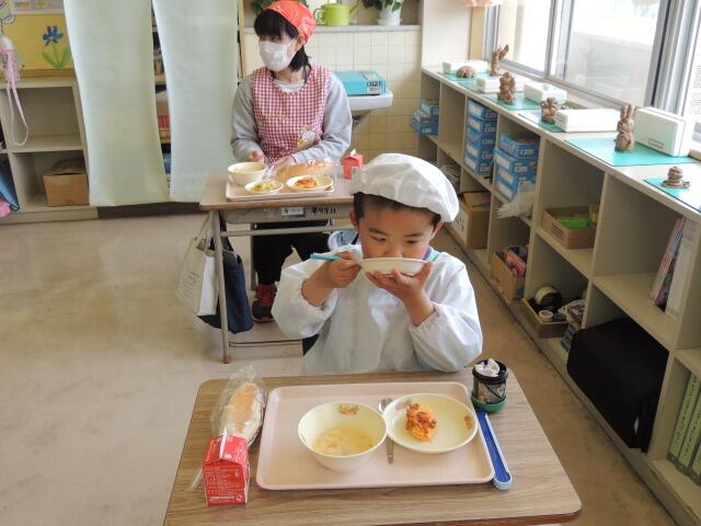 今日の給食は、鶏肉のパン粉焼き、アスパラガスのソテー、豆乳スープです。今日は3年生の教室。身支度の準備が遅れた友達の分も、他の友達が食缶や食器を持ってきていました。さすが3年生です!