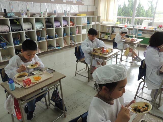 今日の給食は、鶏の唐揚げ、春雨サラダ、ワンタンスープです。今日は6年生の教室。お昼の放送の音楽の話題で盛り上がっていました。ちなみに最近のお気に入りは「Hallow Hallow」という短い英語の曲です。