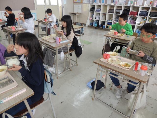 今日の給食は、オムレツのミートソースがけ、ツナサラダ、コーンポタージュです。(メニューの写真を撮っていませんでした。)今日は1・2年生の教室。小学校の生活に慣れてきた1年生、給食の準備も上手にできるようになりました!