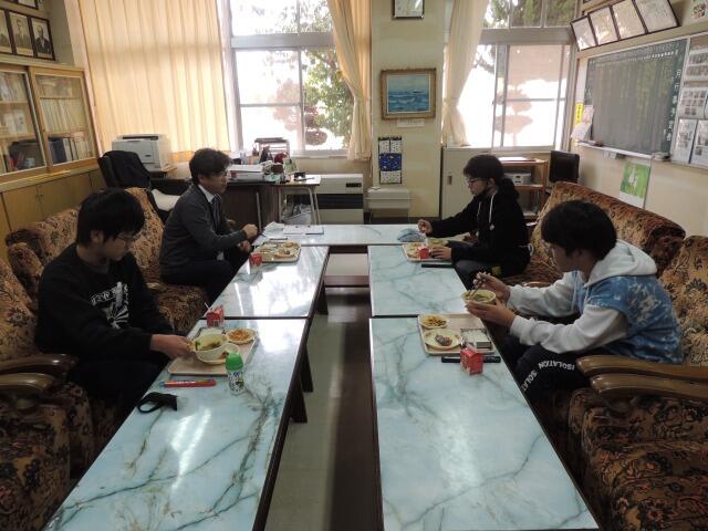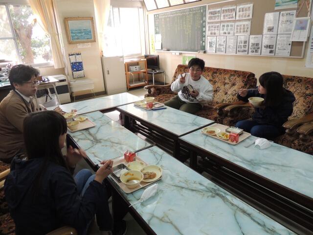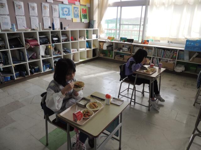 今日の給食は、サメチリ、青梗菜の和え物、ピリ辛ワンタンスープです。今日は2年生の教室。みんな笑顔でサメチリをほおばっていました。気仙沼に来て、サメのおいしさを知りました!
