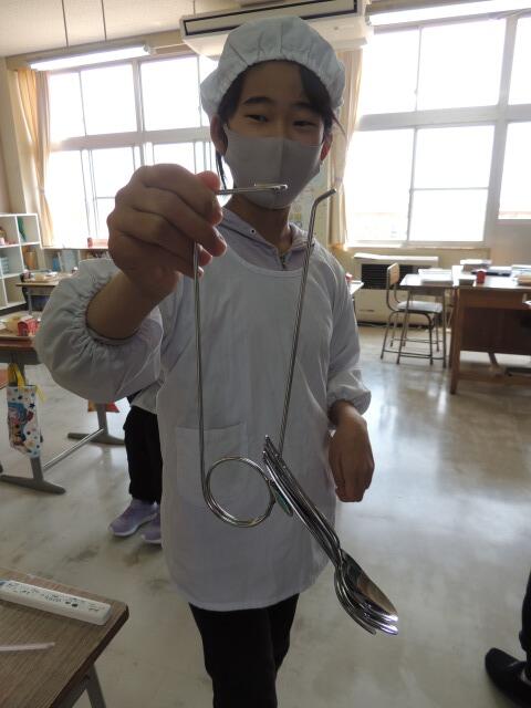 今日の給食は、肉のベーベキューソースがけ、キャベツサラダ、ころころスープ。春キャベツのツナサラダ、柔らかくてとってもおいしかったです。バーベキューソースはショウガとりんごをすり下ろしたもので、酸味と甘みが絶妙でした。5年生静かに落ち着いて食べていました。そうそう、面白い形のスプーン入れ(?)を見せてもらいました。