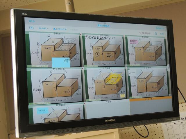 階段の体積を調べます。タブレットで階段を二つに分けたり、欠けたところに立体を足したりして体積を求めます。求められたら、他のやり方がないか考えます。解いた結果を先生のタブレットに送ります。友達の解き方と自分の解き方を比較しました。