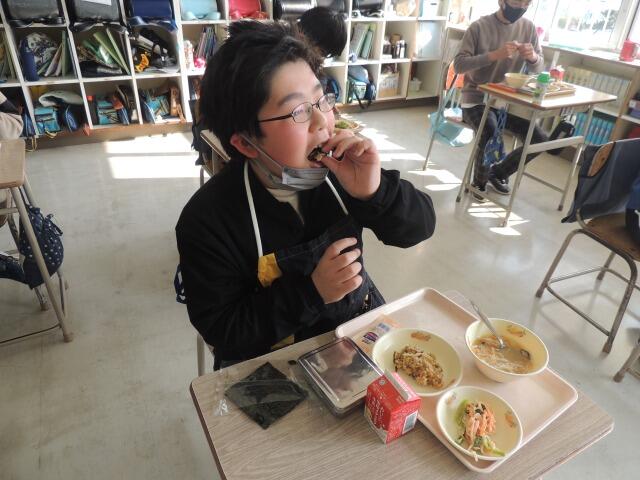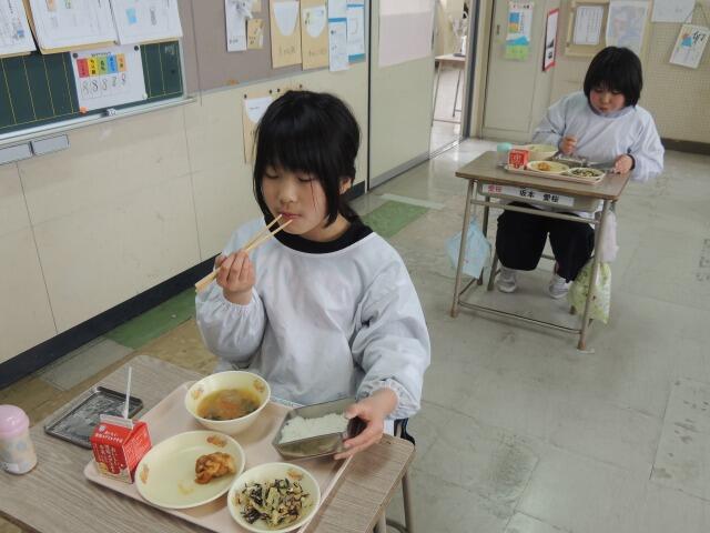 今日の給食は、さばのピリ辛焼き、タケノコのごま油炒め、味噌野菜スープです。今日から校長室で6年生との卒業会食がスタートしました。トップバッターは男子3人。「校長先生、ももクロは誰推しなんですか?」「自分を漢字一文字で表すとどんな漢字になりますか?」など、考えてきた質問をたくさんしてくれました。いつもは、黙食の給食ですが換気とソーシャルディスタンスを保ちながら、楽しく会食できました。明日も、とっても楽しみです。