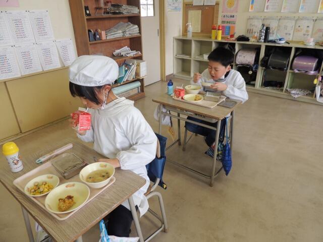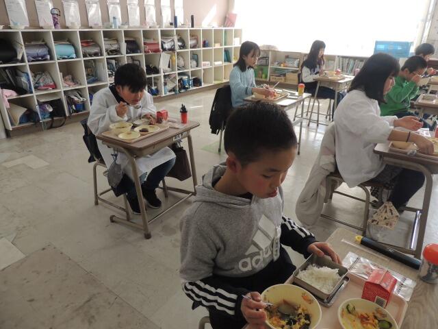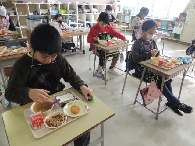 今日の給食は、豚肉のアップルソースがけ、ジャガイモのカレーソテー、卵スープです。昨日に引き続き、6年生との会食。今日も入りたい部活動や中学校でのクラス分けについて話を聞きました。お笑い好きの児童と好きな漫才師やコント師についての話でも盛り上がりました。楽しいひとときでした。