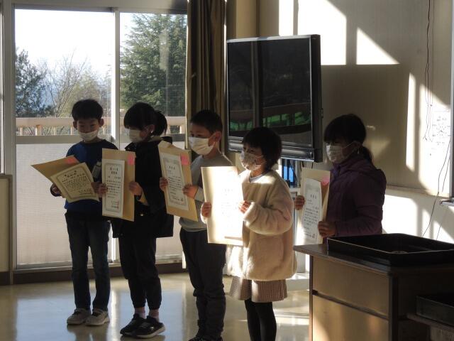 図書室の本をたくさん借りて読んだ「多読賞」の賞状を伝達しました。1位が41冊、2位は39冊、3位は35冊です。なんと全員2年生。本が大好きな学年です。来年は他の学年のお友達もたくさん借りて読めるような工夫をしていきたいと思います。