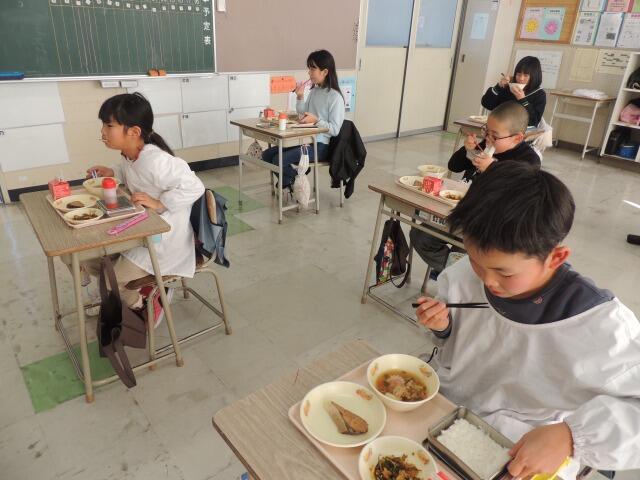 今日の給食は、煮込みおでん、いそかあえ、いわしのオレンジ煮です。今日は2年生の教室。担任の先生の「おでんのうずらの卵を1個ずつ追加します。」に大喜び!子どもはうずらの卵が大好きです。