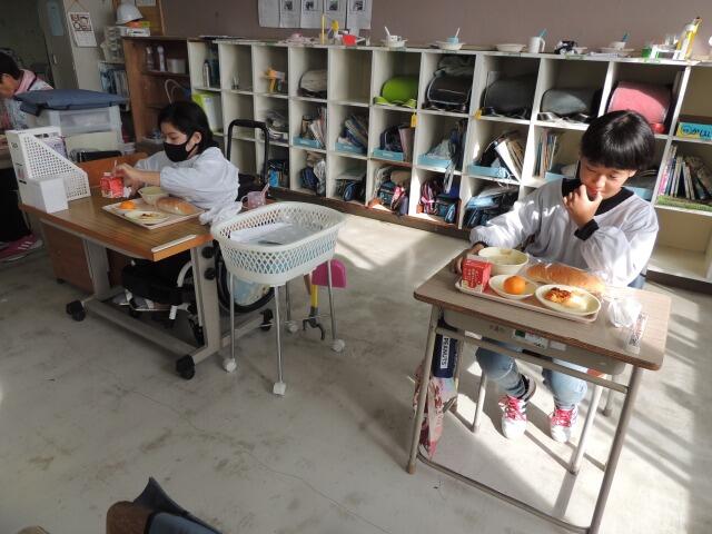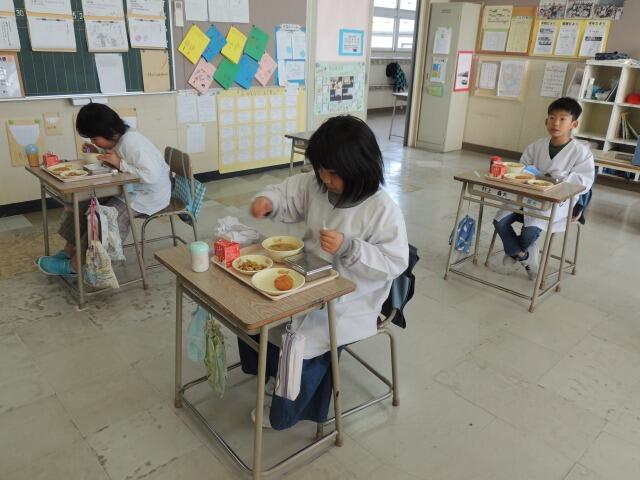 今日の給食は、ささみのアップルソースがけ、レンコンサラダ、コロコロスープです。今日は4年生の教室。欠席の少ない大島小学校ですが、今日は各学年で欠席が多いため、いつもは元気な4年生も静かに黙食をしていました。