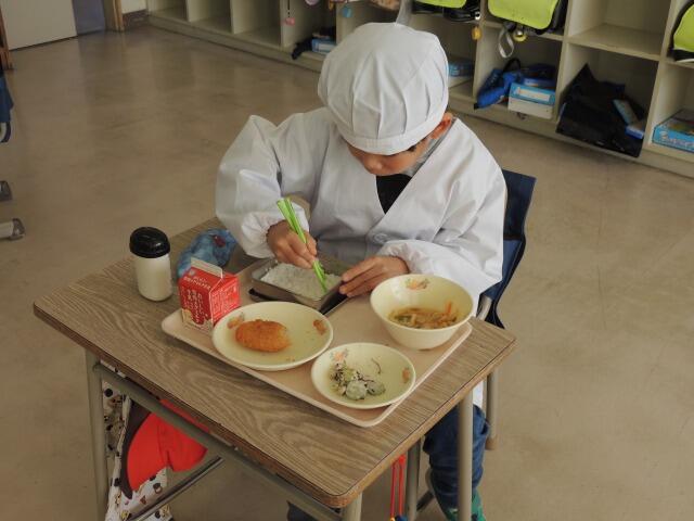 今日の給食はチンゲンサイのツナマヨ和え、豚の生姜焼き、キノコの味噌汁です。今日は1年生の教室。味噌汁に夢中になっていた児童に「おかずや味噌汁の間にご飯を食べるといいですよ。」と先生が教えていました。昔、「三角食べ」について指導されたことを思い出しました。