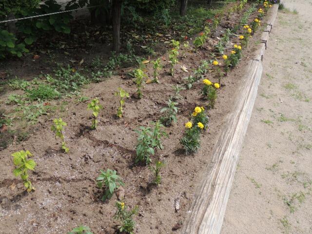 ここ数日、梅雨に戻ったかのような天候が続いていましたが、久しぶりに太陽が顔を出しました。今日も元気に子どもたちは登校してきました。いつものように5・6年生が挨拶運動で児童を迎えていました。4月28日に「大島小学校向上計画・大島小学校花いっぱい運動」で児童がまいた花の種がひっそりと花を咲かせていました。