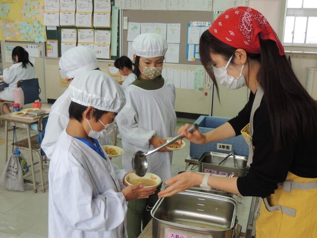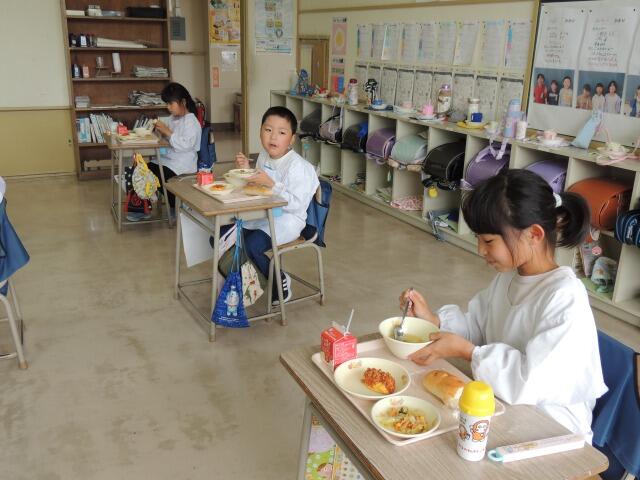 今日の給食は、ココアパン、チーズオムレツ、枝豆とチキンのサラダ、トマトスープスパゲティです。今日は3年生の教室。今日のメニューとは関係ないのですが、「お刺身と焼き魚、どっちが好き?」と尋ねると、みんな「お刺身!」という答え。おいしい新鮮な魚を食べているからなのでしょうか。ちなみに私は、焼き魚派です。