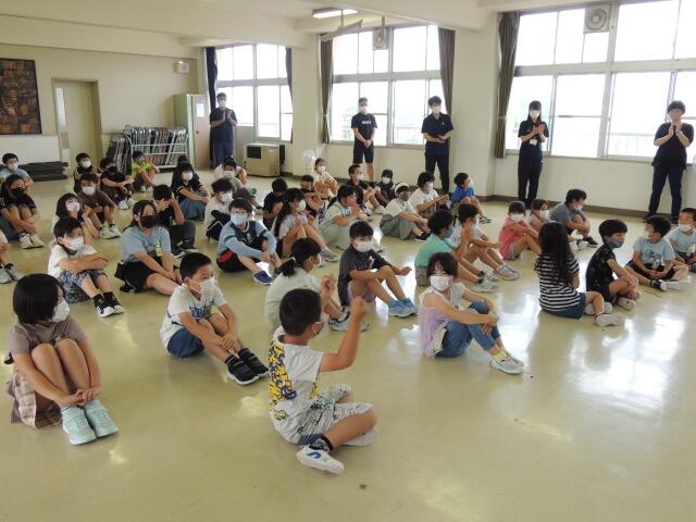 砂との死闘を繰り広げ、遂に各班の海の生き物が完成しました。1班の作品は「かに」。「リアルで賞」に入賞しました。今にも動き出しそうな作品でした。2班の作品は「くじら」。「迫力があるで賞」に入賞しました。海に向かって泳ぎ出しそうな勢いを感じる作品でした。3班の作品は「かじき」。「クールで賞」に入賞しました。かっこよく、すごいスピードで泳ぎそうな作品でした。4班の作品は「かつお」。「そっくりで賞」に入賞しました。おなかの肉付きがよく、脂ののった作品に仕上げました。どの班も6年生を中心に、力を合わせ、作品を完成させていました。閉会式では、各学年の代表児童が感想を発表しました。「来年は、上学年になってアイディアを出したい。」「これまで作った中でも一番うまくできた。」等の感想がありました。ビーチの施設で足を洗わせていただき、お礼を言って、小田の浜を後にしました。夏休みの前日、また一つ良い思い出を作ることができました。明日からは楽しい夏休みを過ごしてください!