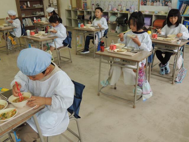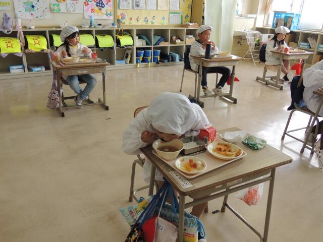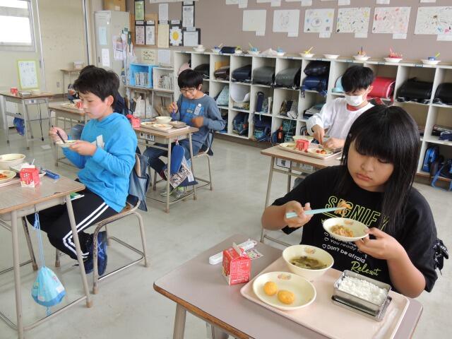 今日の給食は、豚汁、厚焼き卵のそぼろあんかけ、キャベツのおかかあえです。今日は6年生の教室。いつも黙食で立派に食べています。給食の時間、5・6年生には委員会の仕事があります。今日も5年生の生活委員の児童が献立を知らせ、6年生の放送委員の児童が昼の放送(今日はみんなの歌)を流してくれます。毎日、ごくろうさまです。