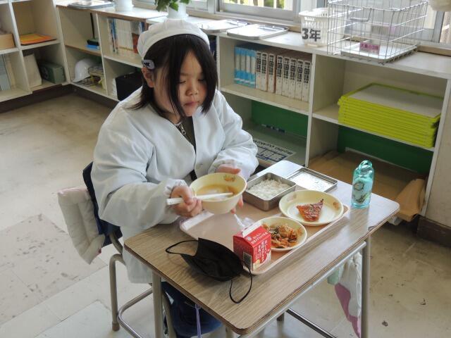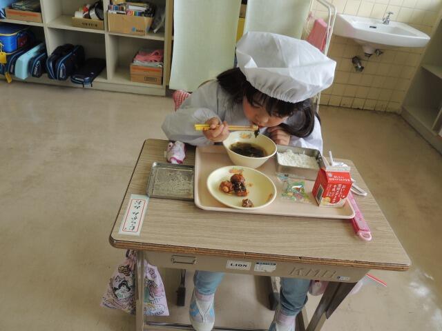 今日の給食は、きびなごのカリカリフライ、ホイコーロー、豆腐の中華煮。きびなごはクッキー感覚で食べられるほどカリカリに揚がっていました。今日は4年生の教室。きびなごがちょっと苦手と話していた児童も頑張って食べていました。豆腐の中華煮の中に入っていたウズラの卵をおいしそうにほおばっている児童もいました。