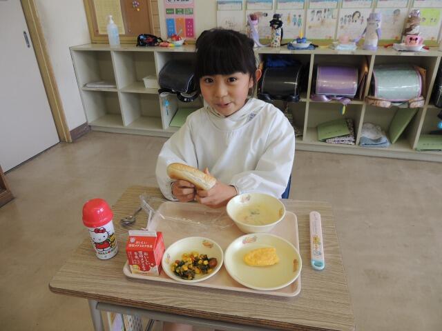 今日の給食は、ソフトパン、卵のベーコン巻き、ホワイトシチュー、河内晩柑(かわちばんかん)。旬の果物の河内晩柑は、和製グレープフルーツとも言われますが、グレープフルーツのような苦みがなくとっても甘い給食のデザートにもってこいのフルーツです。今日は5年生の教室。ソフトパンの柔らかい歯触りに驚いていました。