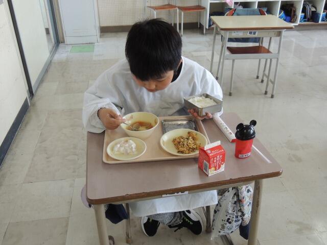今日の給食は、ポークソテー、ひじきのサラダ、コンソメスープ。今日は3年生の教室。あっという間に準備を終え、いただきます!窓際では、理科の学習の教材「モンシロチョウの幼虫(青虫)」もおいしそうにキャベツの葉っぱを食べていました!