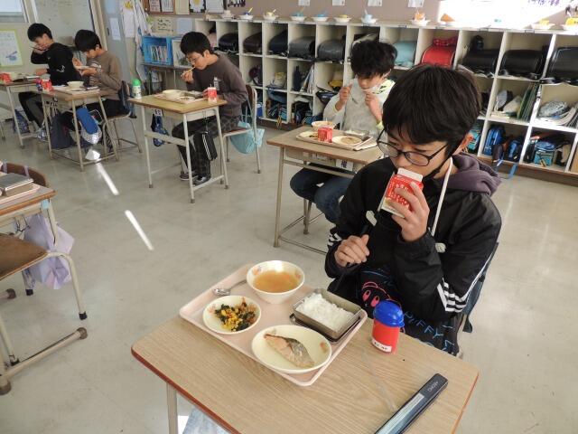 今日の給食は、ぶりの照り焼き、すき昆布と豚の炒め物、白玉雑煮です。今日は4年生の教室。白玉雑煮に、「お餅、苦手なんだよなあ。」や「なるとがいっぱい入ってる!」などいろいろな感想が聞かれました。昔、中華ソバにはなるとが必ず入っていましたよね。今日は「ぱくぱくデイ」(完食を目指す日)です。おいしく全部食べましょう!