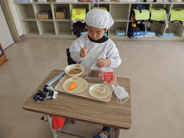 今日の給食は、仙台青葉の餃子、豆腐の中華煮、橙のムースです。(橙:だいだいとは鏡餅の上にのっているみかんの一種で、木に1年、2年、3年と代々なり続けることからこの名前が付いたおめでたい果物です。)今日は3年生の教室。久しぶりの給食に満足げな様子。お正月は餅をいくつ食べたか聞いてみると、多い子で10個でした。また、今日の昼の放送では、今年度、昨年度と大島小学校に寄付をいただき、今年は自分たちのCDも贈っていただいた「SOCCER☆SCHOOL」さんの曲をオンエアしました。