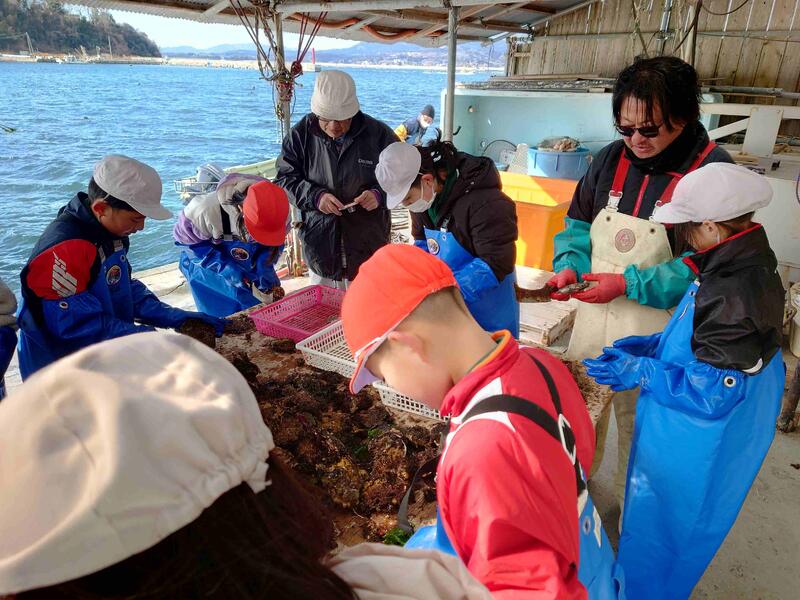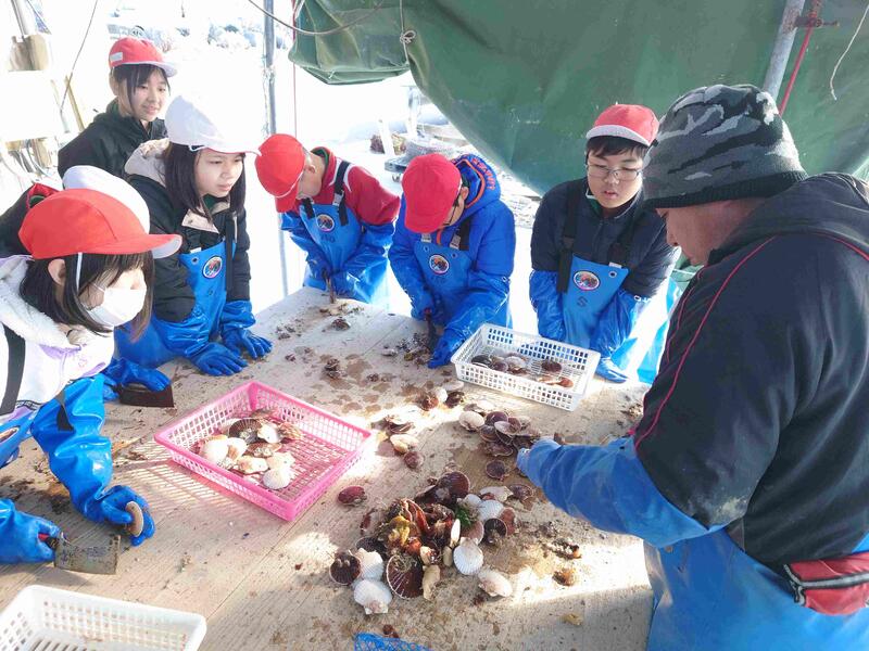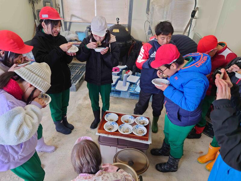 総合的な学習の時間に、6年生がホタテの養殖体験をしました。菊田俊秀様の作業場をお借りして、小松博文様と小松俊浩様にご指導いただきながら、「背ばたき」と「分散」の作業を行いました。苦戦しながら作業していた子供たちも、経験を重ねるに従って手際よく作業することができました。作業後にはホタテをごちそうになり、質問にも答えていただきました。