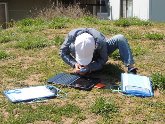 校庭に飛び出し、春の生き物探し。手には生活科バックとタブレット。文字入力になれていない3年生は、画像はタブレットに、文字は学習シートにと2刀流での観察です。同じ時間に春探しをしていた4年生に負けないくらい一生懸命観察していました。