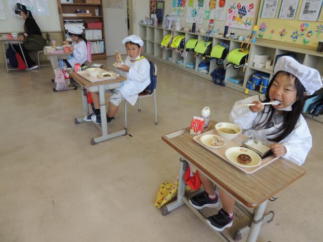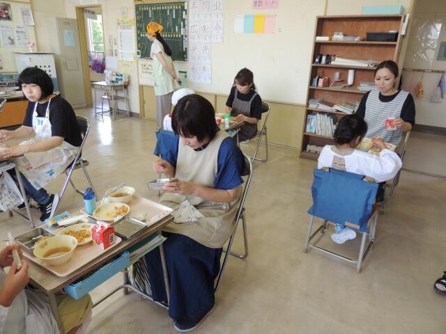 今日の給食は、五色そぼろ、七夕汁、七夕デザート(七夕メニュー)です。今日は、3年ぶりに給食試食会を実施しました。給食センターより栄養教諭の先生に来ていただき、メニューの説明や大島小学校の残食についてお話ししていただきました。(大島小学校は市内でもダントツで残食が少ないそうです!)1年生~3年生のたくさんの保護者の皆様が参加しきました。ホームページで毎日見ていただいている給食ですが、今日は実際に味わっていただきました。