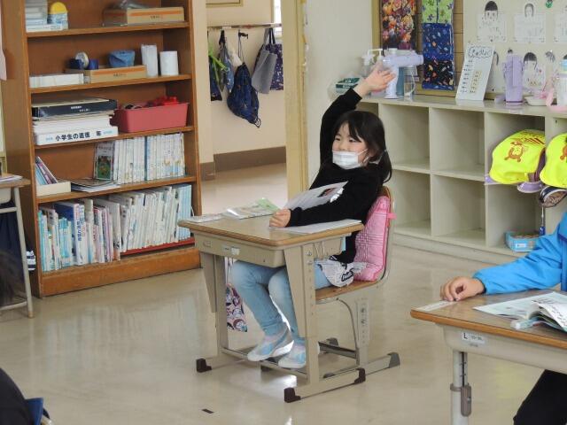 帰りの会で今日頑張ったことを発表しました。「道徳でいろいろ考えるのを頑張りました。」「他にはありませんか?」「国語の時間、全部頑張りました。」先生に手伝っていただきながら司会も上手にできました。