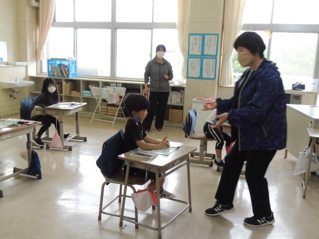 リズムうちの学習です。「たん・たん・たん・うん」のリズムで「ぐう・ちょうき・ぱーのうた」を歌ったり、手拍子を打ったりしました。次に3文字の果物の名前を発表し、「たん・たん・たん・うん」のリズムで3文字の果物のリレーをしました。簡単そうでしたが、子どもたちにはけっこう難しかったようです。